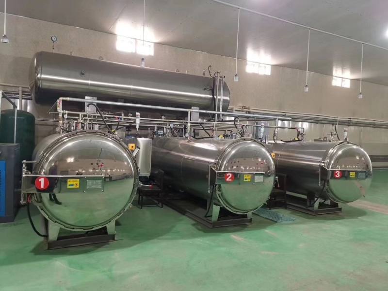 1.高温短时杀菌。两台杀菌釜共用一台热水罐工作,工艺水温度高,缩短了升温时间,双釜交替使用等待时间短,提高了工作效率;